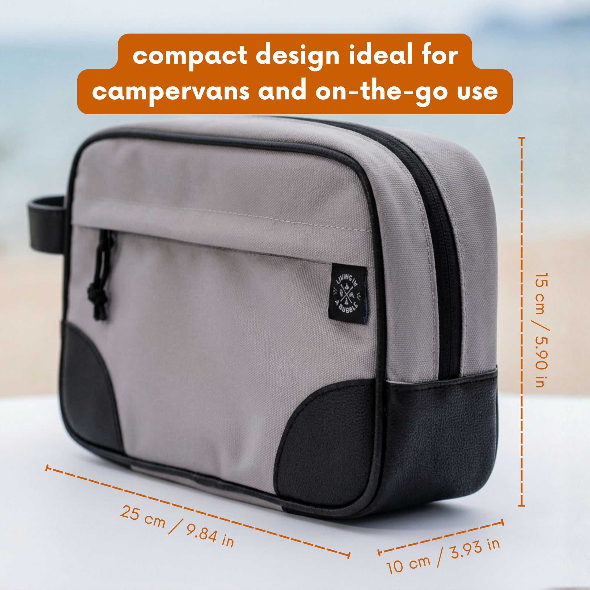 1. Convenient Grab-and-Go: Instantly attach this bag to any metal surface in your van, or detach it in seconds to take it with you.2. Secure Magnetic Mount: Secures your bag in place, so you don't have to worry about it slipping or falling.3. Versatile Storage: Perfect for organizing your toiletries, hygiene essentials, or small accessories.4. Durable Built: Made with durable, premium-quality fabric to handle the demands of life on the road.5. Seamless Integration: Fully compatible with our other Living In A Bubble storage solutions like the Storage Bag and Wall Storages6. Travel-Ready Size: Compact, lightweight, and ideal for campervans, caravans, and everyday use.